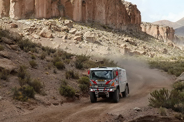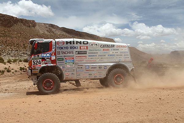 13日のステージで到着の遅れていた日野チームスガワラ1号車菅原義正/若林葉子/羽村勝美組は24時2分にトラック部門総合30位でチリ・カラマのビバークに無事到着。車両はメカニックによる点検を受け、14日早朝に2号車菅原照仁/杉浦博之組とともに元気に出発していった。