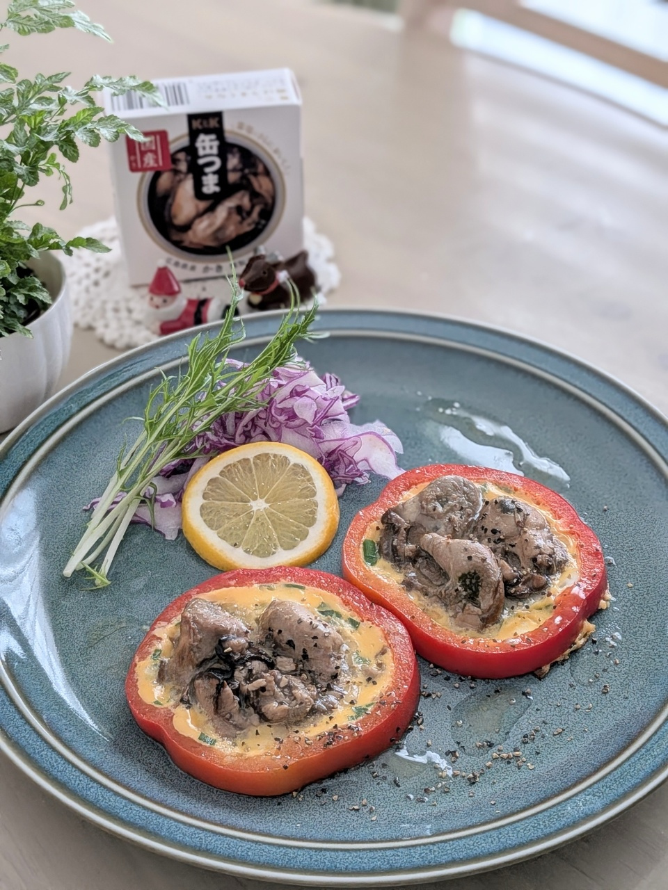 - フライパンに米油を温め、パプリカを置き1を流し、かきの燻製をのせ、蓋をして弱火で卵が固まるまで加熱する。