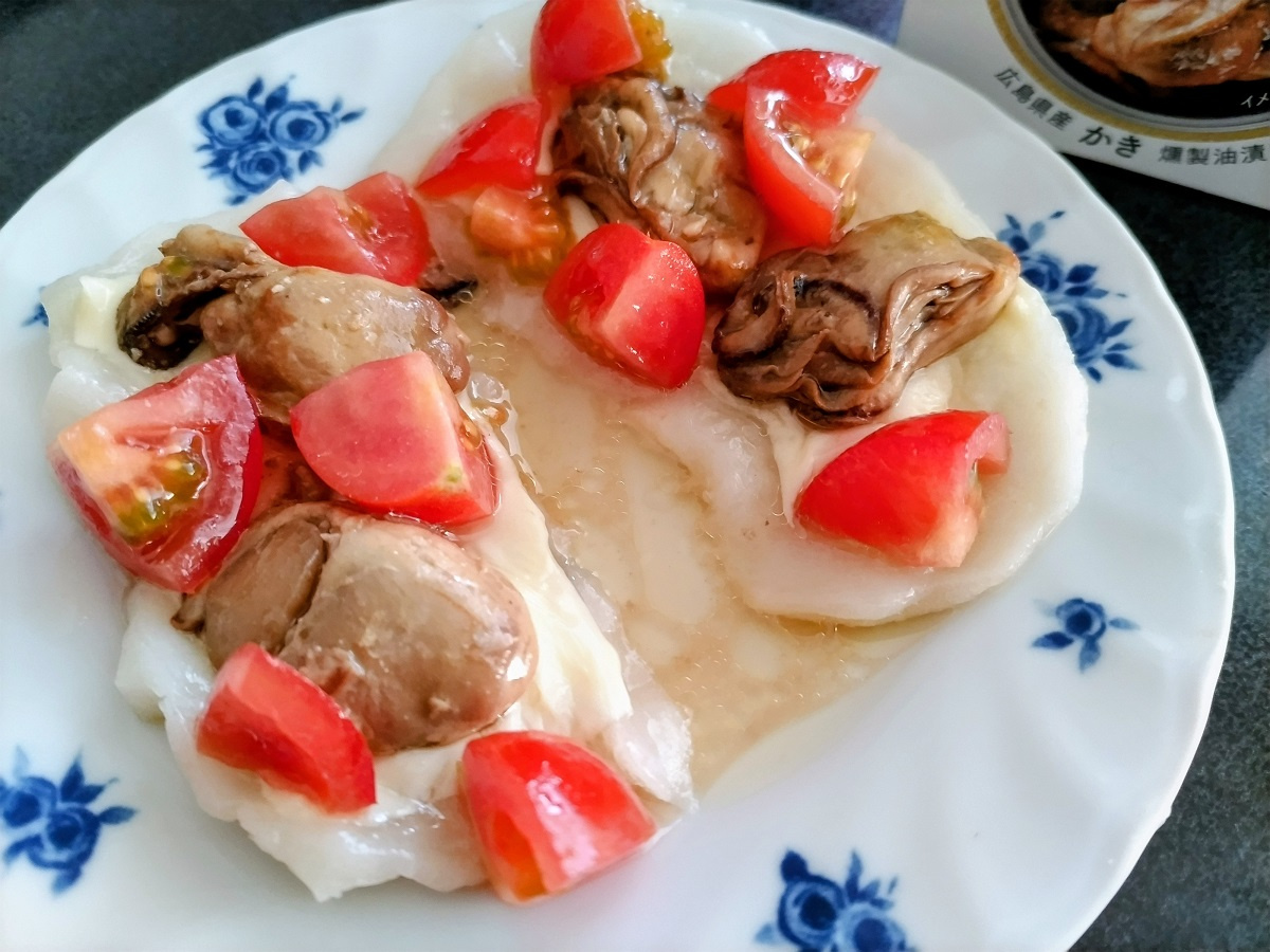- カットしたミニトマトと牡蠣を缶汁ごと合わせ上にのせたら出来上がりです。