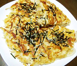 あっさりとした、和風のお好み焼きになるので、醤油や焼きノリ、ゴマの風味が良く合います。