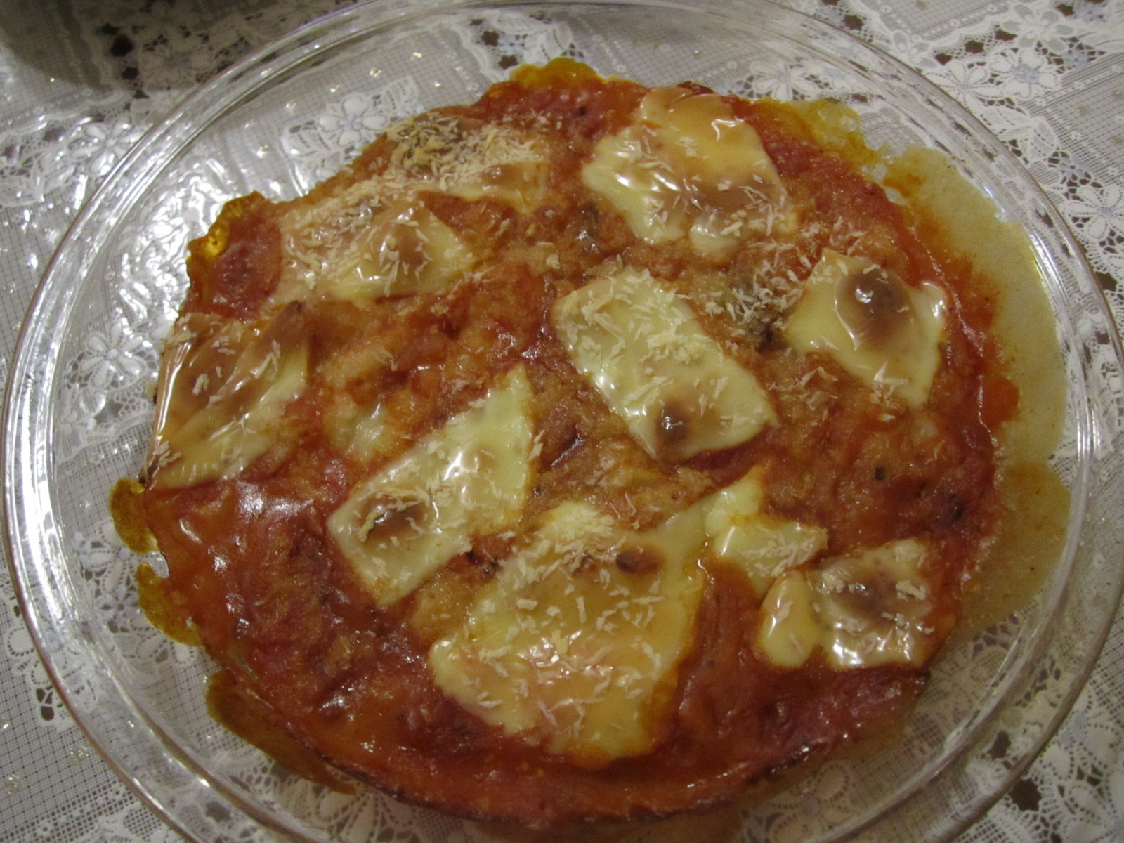 - 耐熱容器に半分の量の2を敷き、半分の量の1をのせ、1枚分のちぎったチーズをのせ、更に残りの2、1、チーズをのせ、パン粉をふりかける。