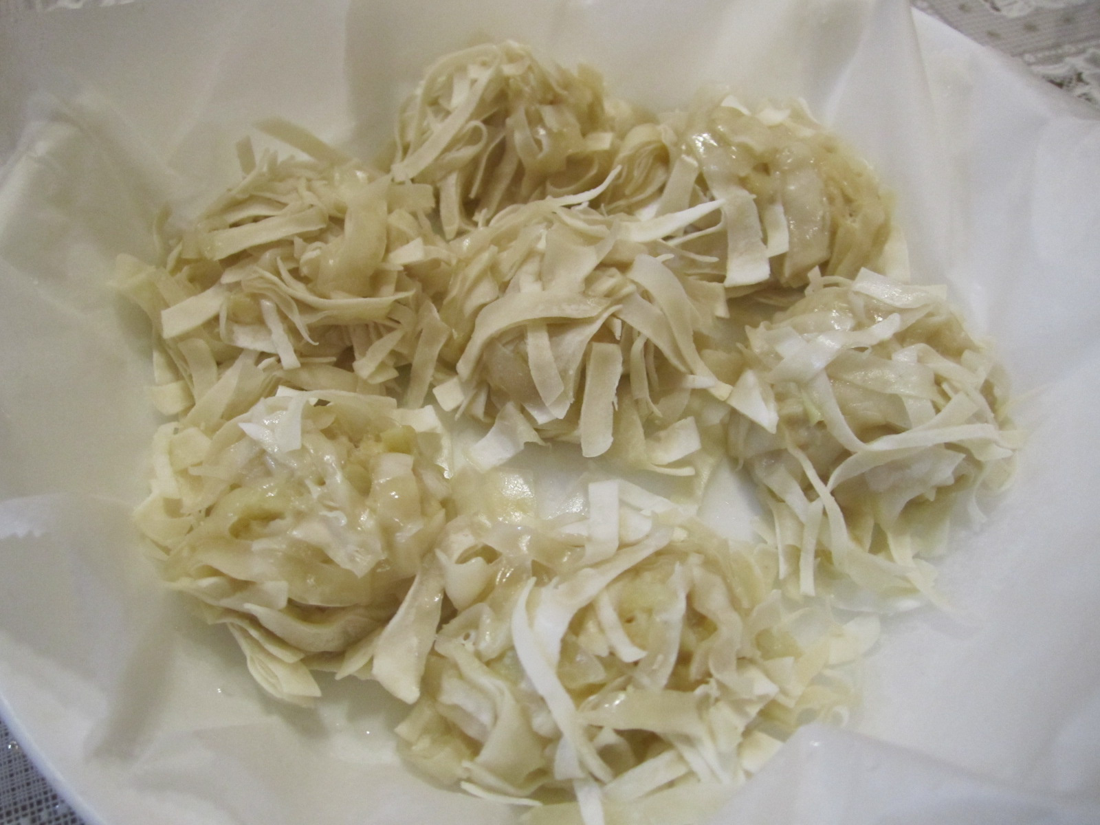 - 赤貝どて煮風を芯にして1で包み、短冊状に切った焼売の皮を全体にまとわせる。