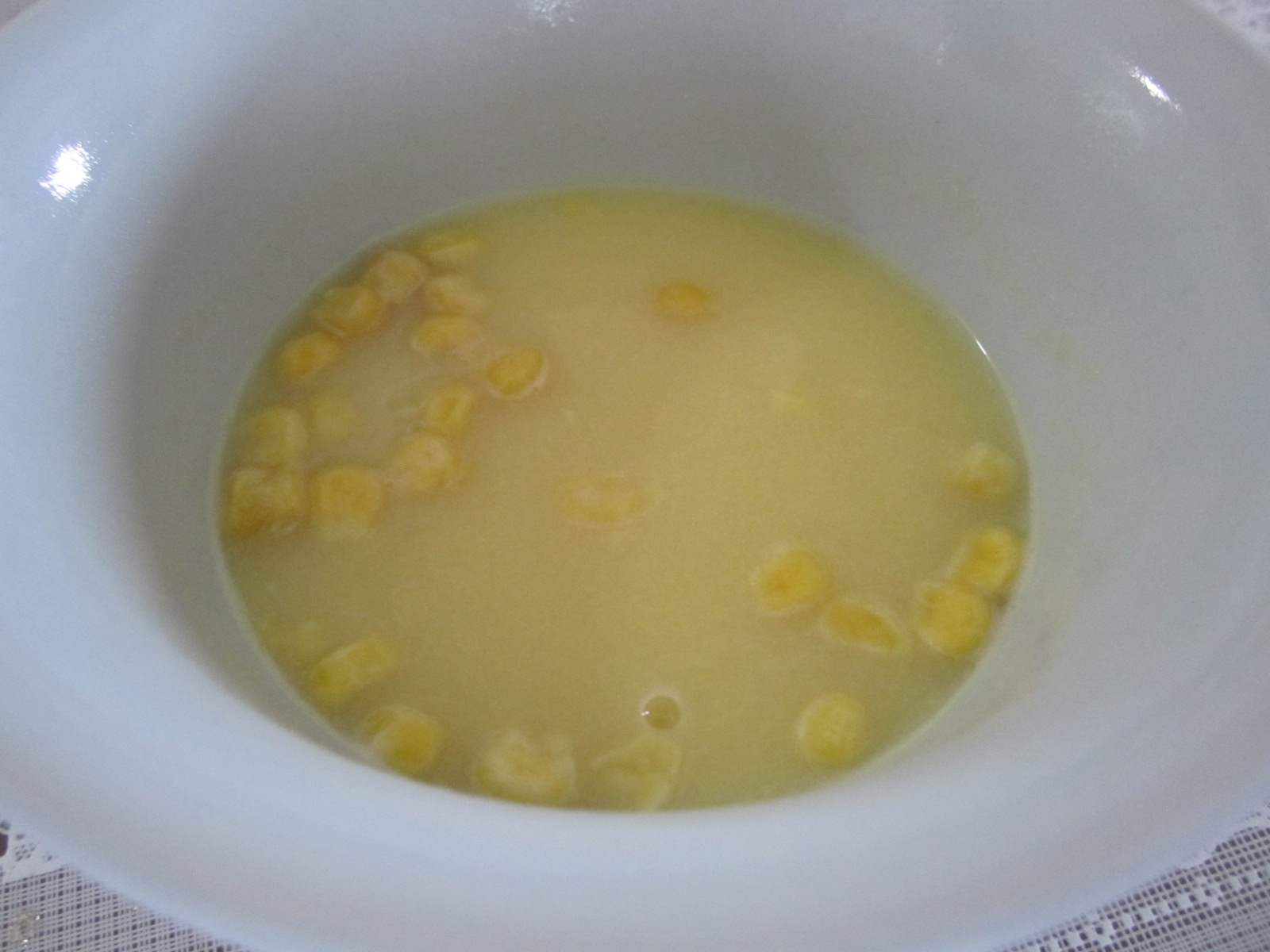 1が沸騰してきたらスイートコーンと中華スープの素を加え塩胡椒で味を調える。