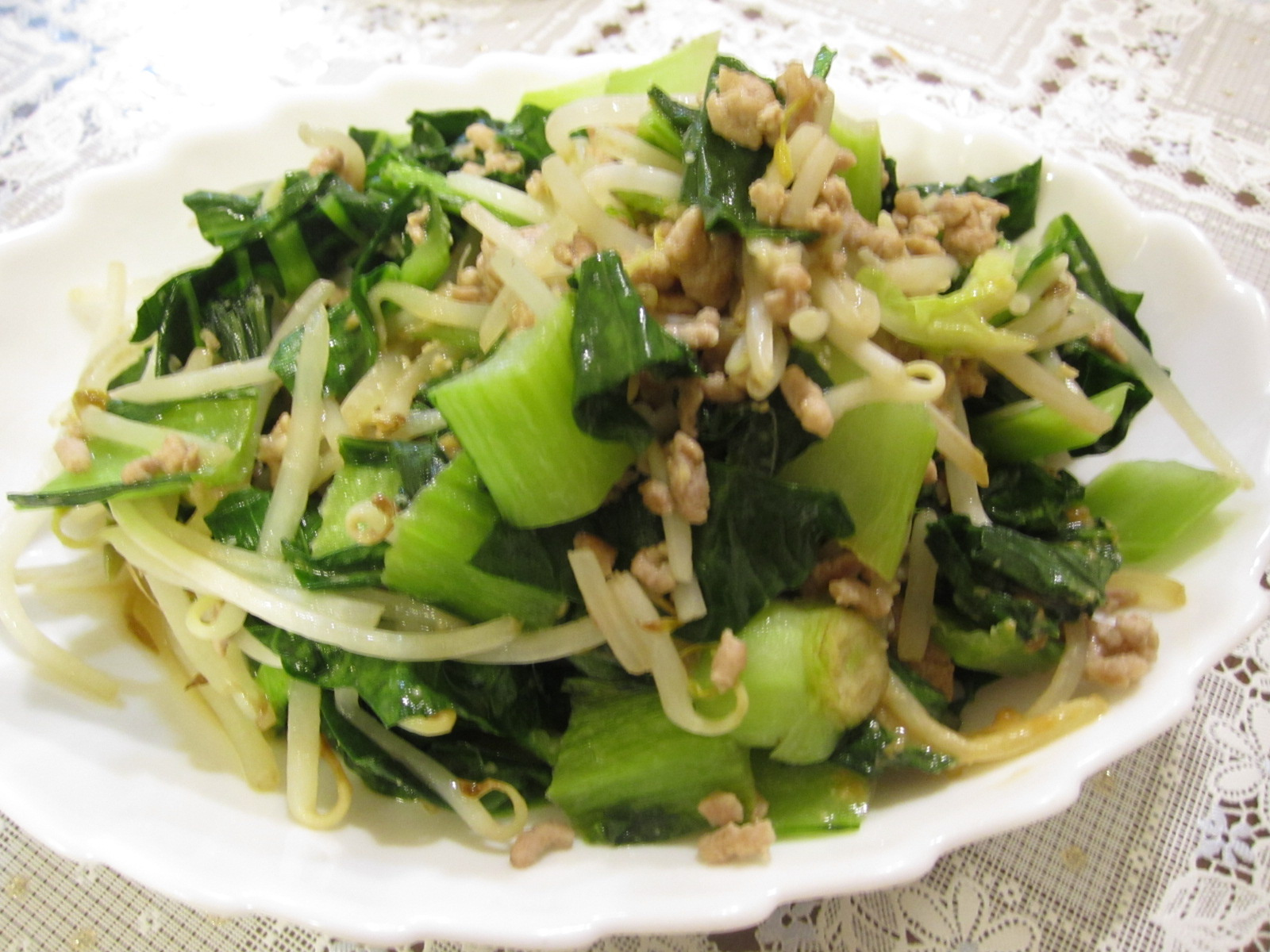 - 火にかけたフライパンにサラダ油を敷き、おろしにんにくを入れていい香りがしてきたら小松菜を入れて炒め、もやしとグルテンバークを加えてサッと炒める。