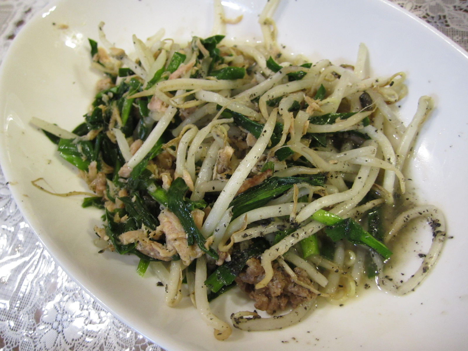 ニラは適当な長さに切り、もやしはひげをとっておく。