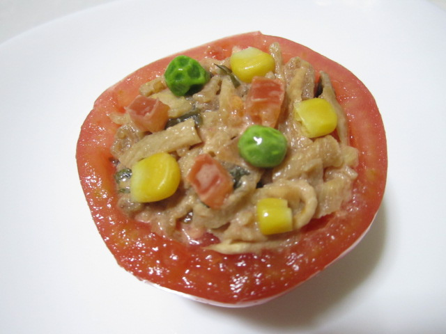 - 1・2のサイコロ状に切ったトマト・スイートコーン・グリンピース・水で戻したわかめを鯛みそとマヨネーズで和える。
