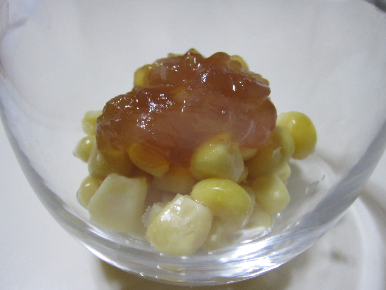 見た目にも爽やかな冷たい小鉢です。 ジュレは食べる直前にかけてください。