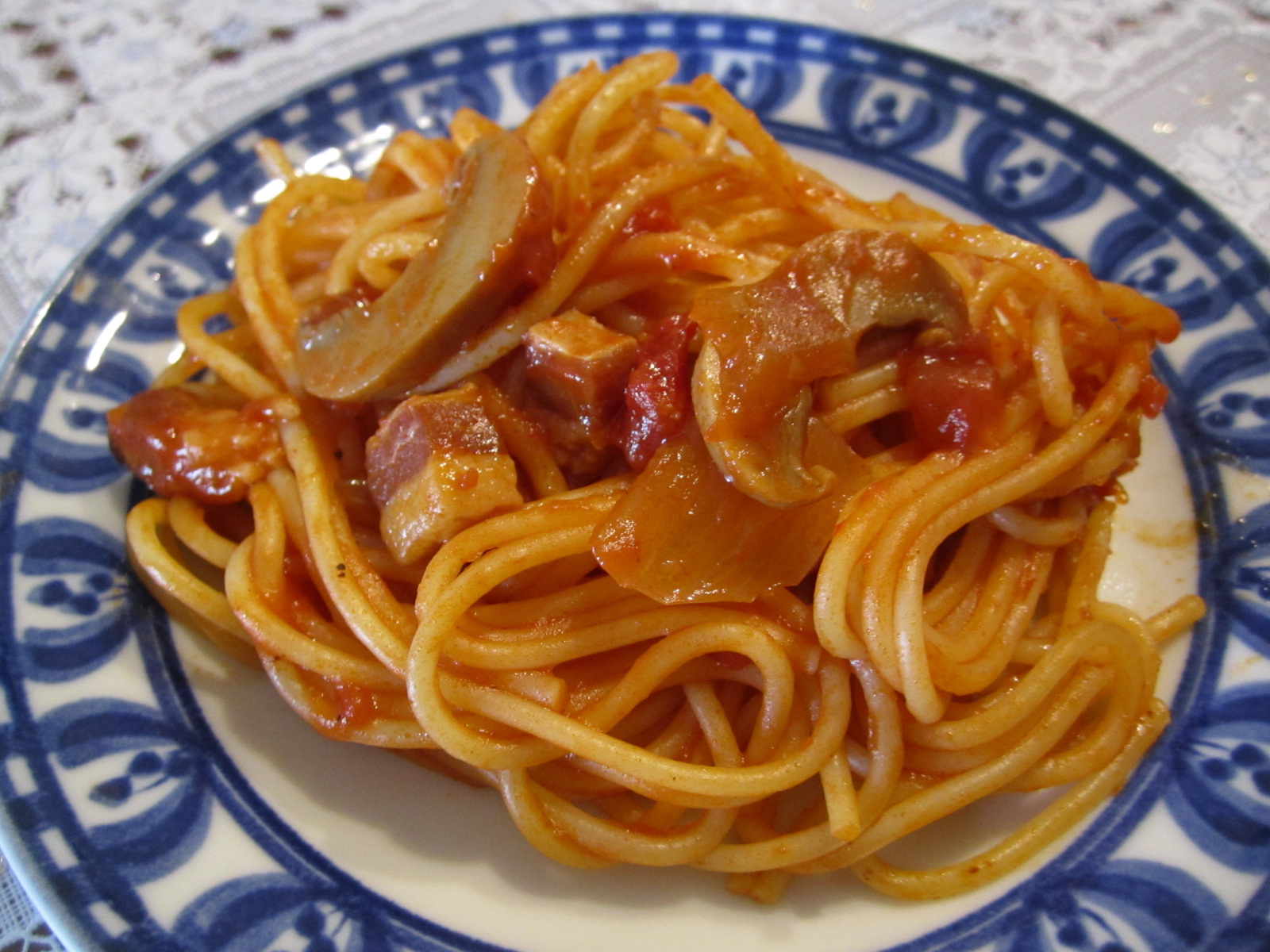 - 1にカットトマト・砂糖・マッシュルーム・厚切りベーコン(缶汁ごと)・串切りにしてばらした玉ねぎ1/2個・ケチャップを加えてサッと煮、塩胡椒で味を調える。