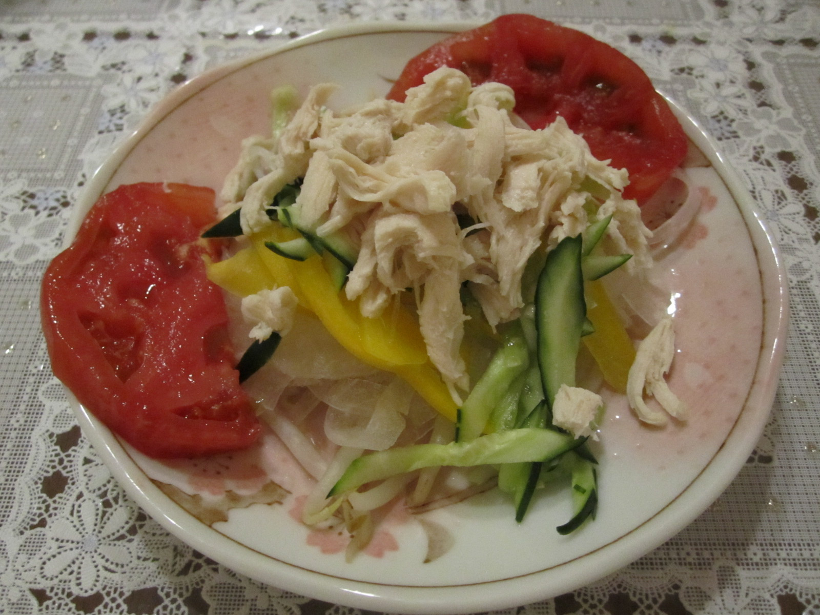 - きゅうりは斜めに輪切りしてからやや太めの千切りにし、パプリカは薄切りにし、玉ねぎは薄切りにしてから水にさらし、もやしはひげをとってからさっと茹で、トマトは輪切りにしてから半分に切る。