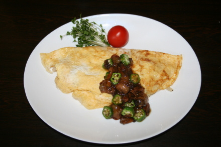- 赤貝とたれとオクラの小口切りに味りん・水を加えレンジで40秒加熱してオムレツの上にかける
