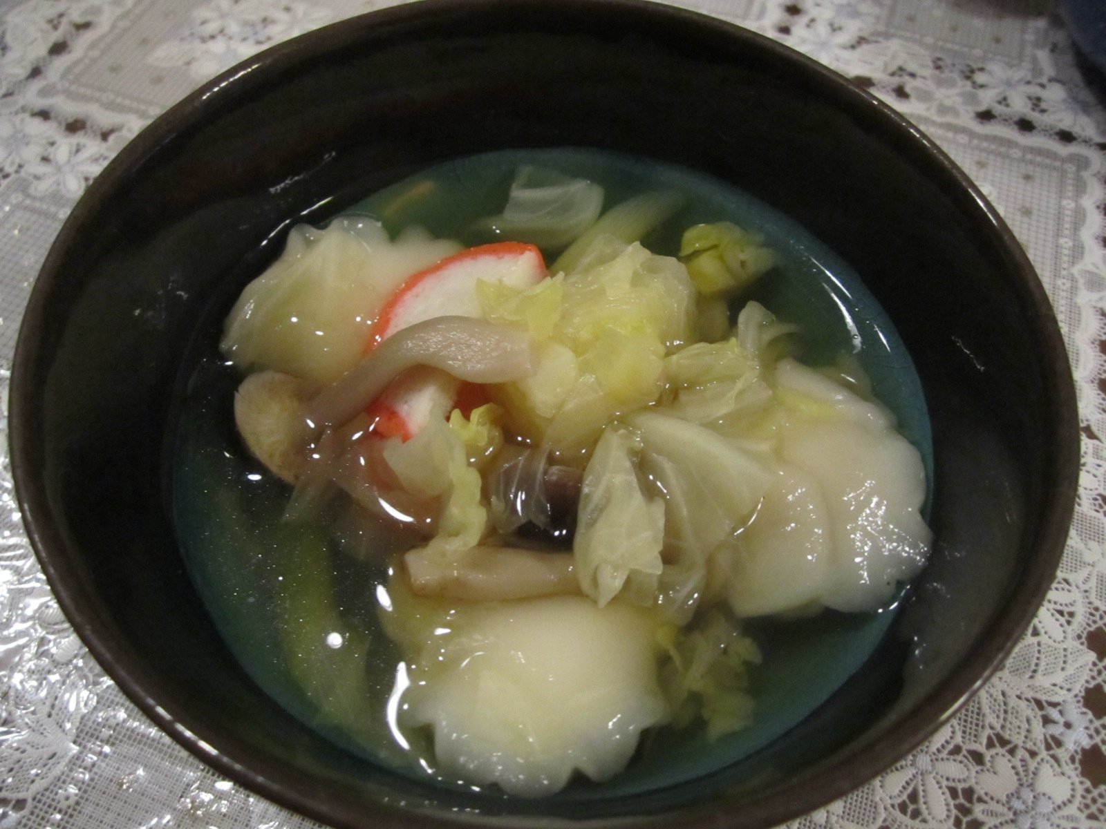 - 鍋に水・粉末だしの素を入れて火にかけ煮立たせ、適当な大きさに切った白菜・ブナシメジを入れて白菜の芯が柔らかくなるまで煮る。