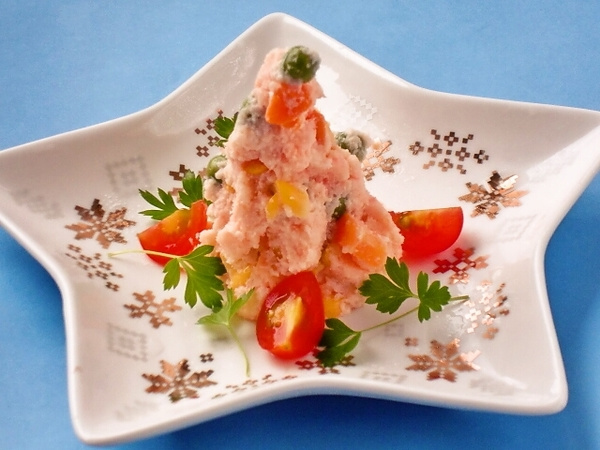 - 皿にツリー型に盛り付け、プチトマトを飾り、イタリアンパセリを散らしてできあがり。