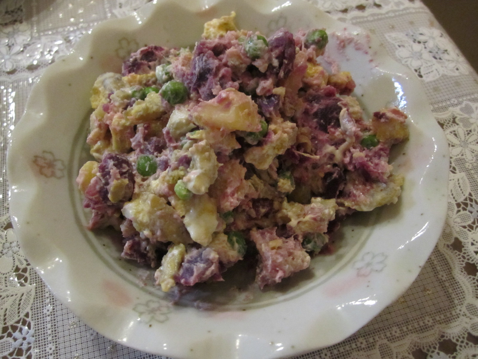 紫・黄・緑のファンタジックなカラーリングのサラダです。 ハバネロソースの辛さが芋の甘さとよく合っています。