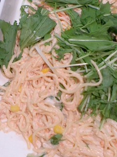 いか明太とマヨネーズはとっても合います。 水菜のシャキシャキ食感と一緒に味わってください。