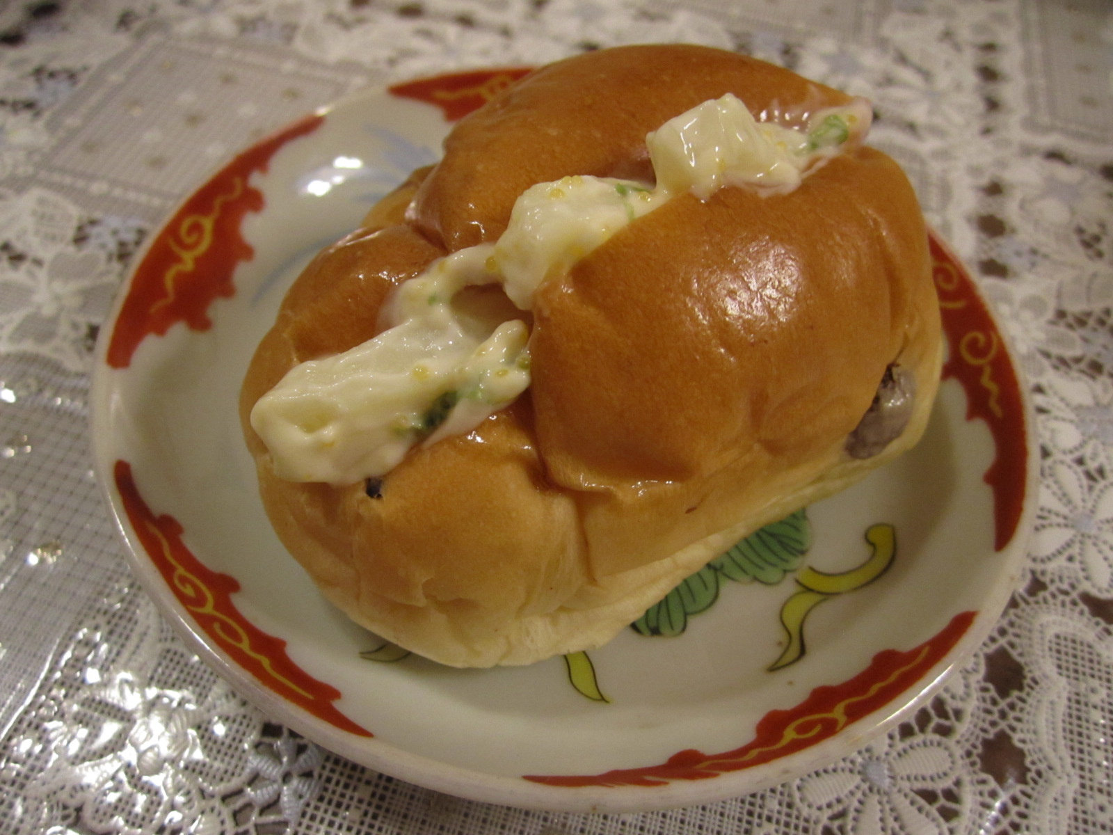 ほっき貝をマヨネーズで和えてサンドにしました。 大葉とほのかな昆布の風味でちょっと和テイストな味になっています。