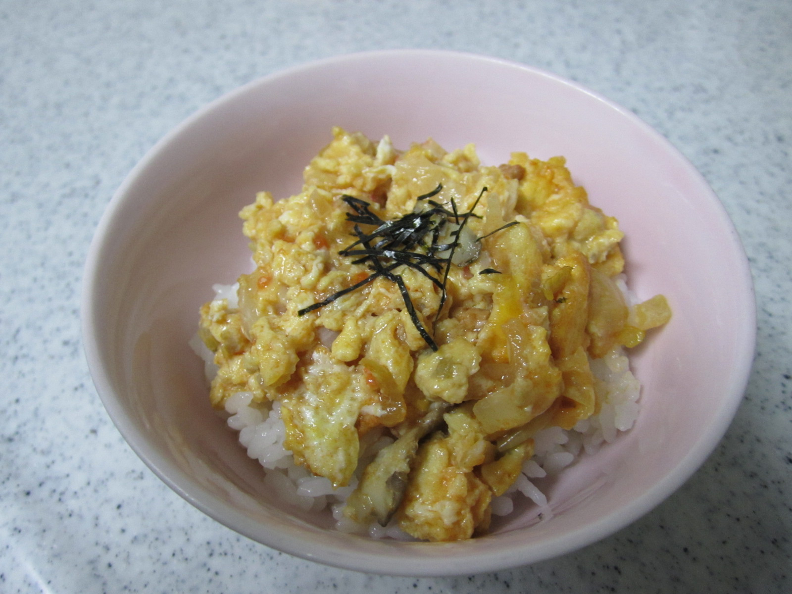 ほっき貝入りの卵丼です。 缶汁を使うことで旨みがぐっと上がります。
