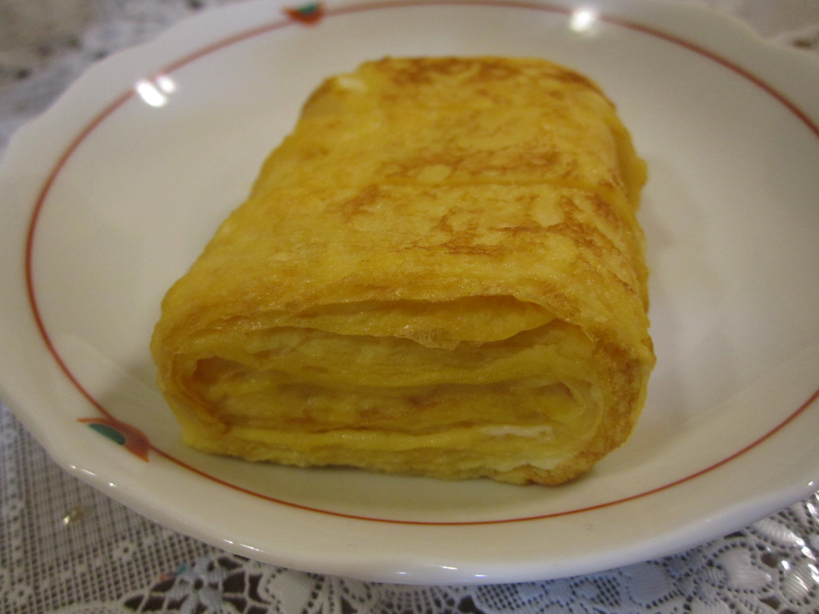 - 32に1を1/3量分流し入れ半熟状になったら巻き、残りの1/3量を流し入れ半熟状になったら巻く。
