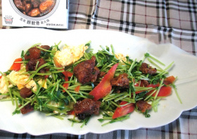 - フライパンにオリーブオイルとにんにくを入れて炒め、そこへピーマンとゴーヤを炒める。