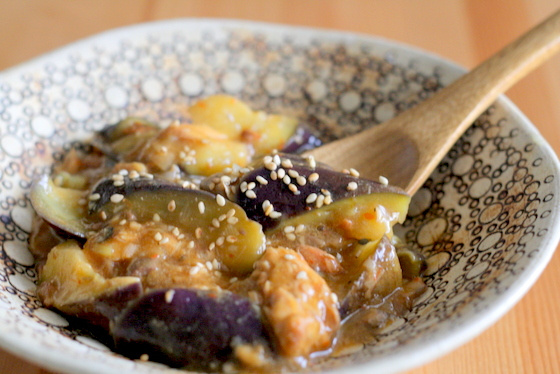 - ボールに茄子、ネギ、ごま油を入れてよく和える。ラップをして600Wレンジで5分加熱する。〇印を入れて混ぜ合わせたら再びラップをして600Wレンジで2分加熱する。