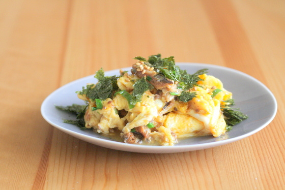 - たまごが半熟状になったら2の和風サーディン、ねぎを加えて軽く炒める。焼きのりとねぎをふったら出来上がり。