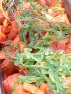 - 3を器に盛り、細切りにしてサッと茹でたピーマンをのせる。