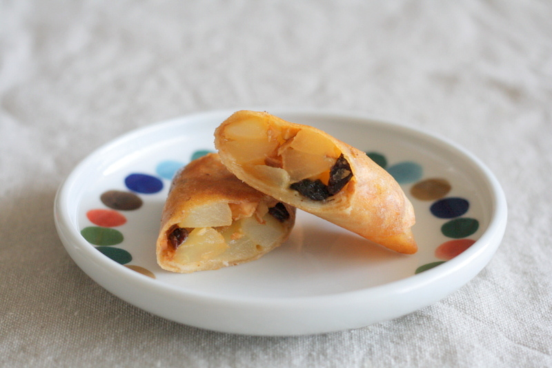 - 春巻きの皮に3をのせて包み、巻き終わりにのりをして結着する。