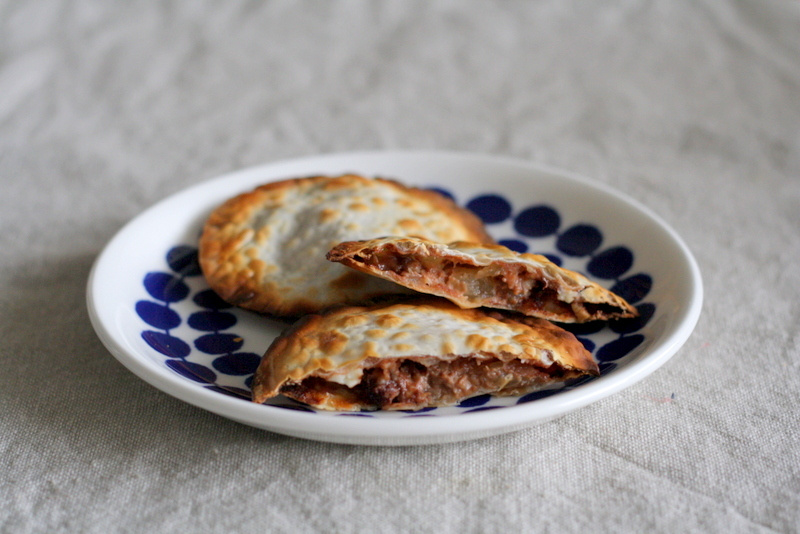 - 餃子の皮4枚を並べて真ん中に2を乗せる。皮のまわりに水をつけて餃子の皮をかぶせて端をフォークで押さえてくっつける。