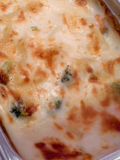 - 適当な長さに切った三つ葉と半分に切った子持ちししゃもと1をざっくりと混ぜて耐熱容器に入れ、ホワイトソースをかけ、粉チーズをふりかける。