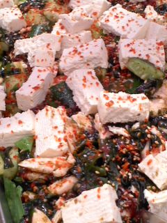 - 木綿豆腐は水気を切ってから適当な大きさに切り、きゅうりは板摺してから乱切りにし、乾燥わかめは水で戻す。