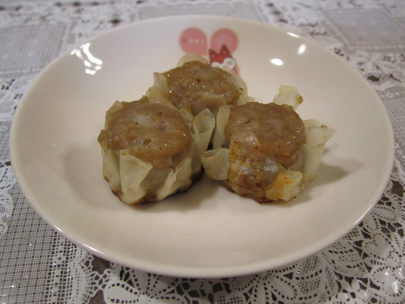- 2を焼売の皮で包み、蒸し器で10分程蒸す。
