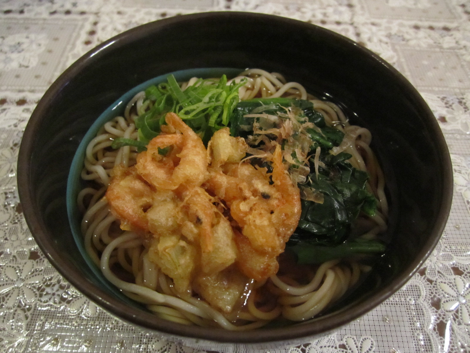 金ふぐとエビの目出度い食材で作ったかき揚げを乗せた、ちょっと豪華なお蕎麦です。 年越し蕎麦としてもピッタリだと思います。