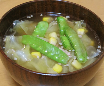 コーン入り絹さやとひき肉のお味噌汁