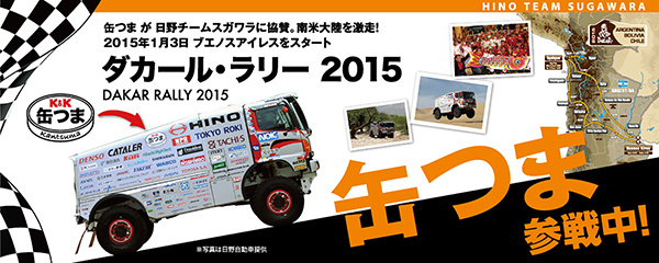 「缶つま」はダカールラリーに参戦する日野自動車のチーム菅原を応援致します。「缶つま」ロゴを掲げ世界ラリーへ、レース進行は随時公開致します。