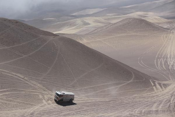 SSはアンデス山麓の前日、前々日と同じエリアで部分的に再走や再々走を組み合わせて構成され、多くの車両が何度も通過することで路面が掘れて深いわだちが出現。砂の中の岩が出てきてパンクの原因になるなど相対的に難易度が高まっていた。山場となったのは終盤50㎞ほどの砂丘で、最後はイキケの標高差600mほどの断崖を駆け下りてビバーク前にゴールする恒例の設定だった。