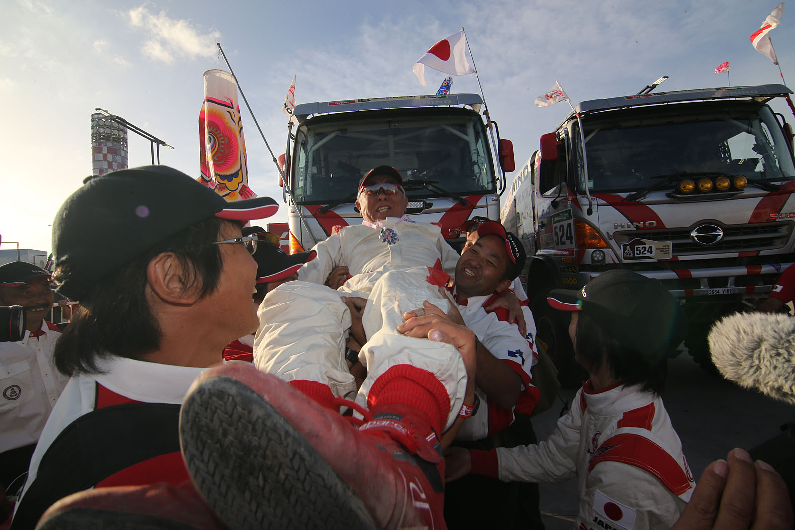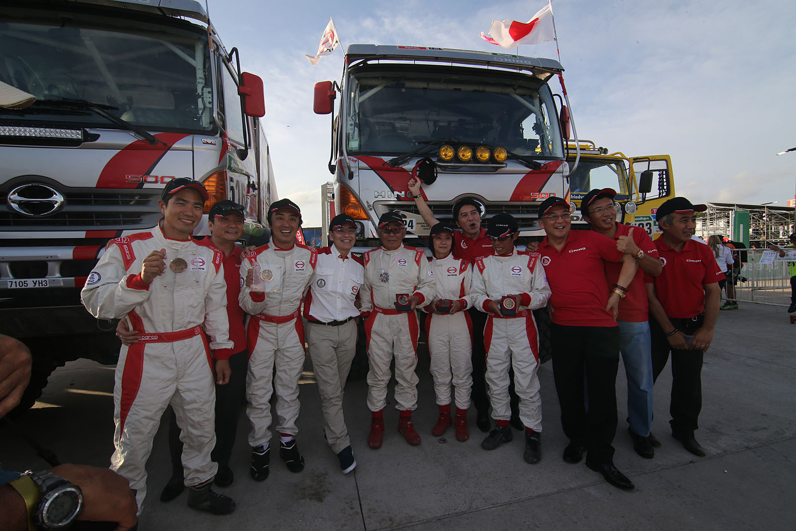 当地でポディウムセレモニーが行われ、土曜日ということもあって数十万人の観客が会場ならびに周辺の道路脇に詰めかけた。日野レンジャーは午後5時 頃、ルーフ上にエンジニアやメカニックを乗せて大きな鯉のぼりや日章旗を掲げながら登壇。2台の乗員は日本から激励に駆けつけた日野自動車市橋保彦社長とがっちり握手をかわし、手を振って歓声に応えていた。
