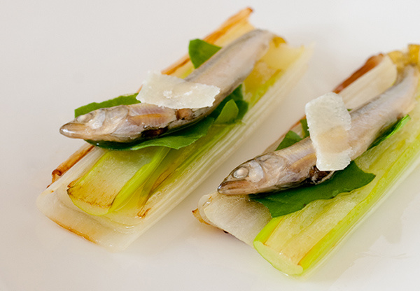 しかし、ふた口目を食べたときに確信した。これは洋風にアレンジしてもイケると。そこでじっくり焼いたネギにルッコラを敷き、上に稚鮎を乗せてパルミジャーノ的なハードチーズをトッピング。こうすると和の味わいだったのが一転して、白ワインが欲しくなる。