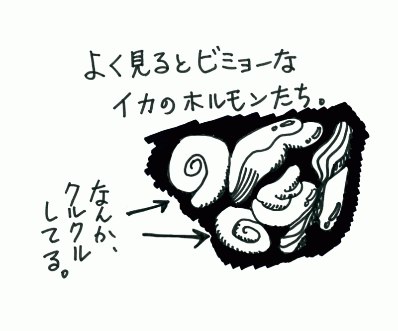 同シリーズの中で、博士のオススメは「いかホルモン」であります。みなさん、いかのホルモンですぞ。そんな食べ物があったこと自体、知らなかった。いくつかの部位がミックスされているので、食感もぷにぷにしていたりねっとりしていたりと様々。