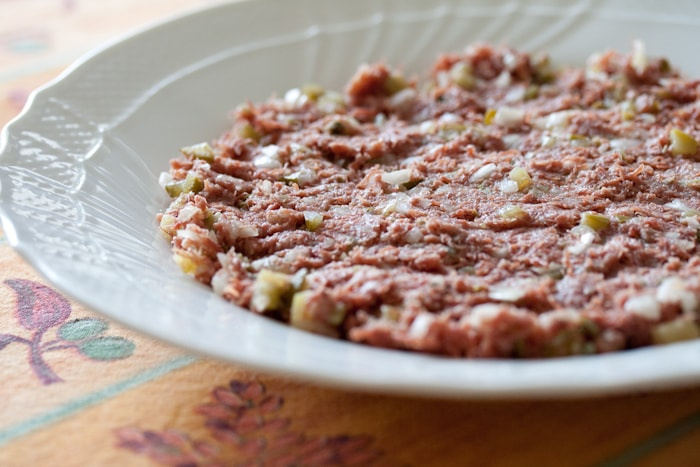 ベースになったのは、フランスで食べた「ステーキ・タルタル」という料理。生の牛肉を細かく叩き切り、そこに玉ねぎ、ピクルス、ケッパーのみじん切りを混ぜこんだものが基本で、食べる前にレモン汁と黒こしょうを掛ける。味の想像が付きにくいかもしれないが、まあイメージとしては韓国料理のユッケに近い。つまりコンビーフ・タルタルは、生の牛肉をコンビーフに替えただけなのだ。