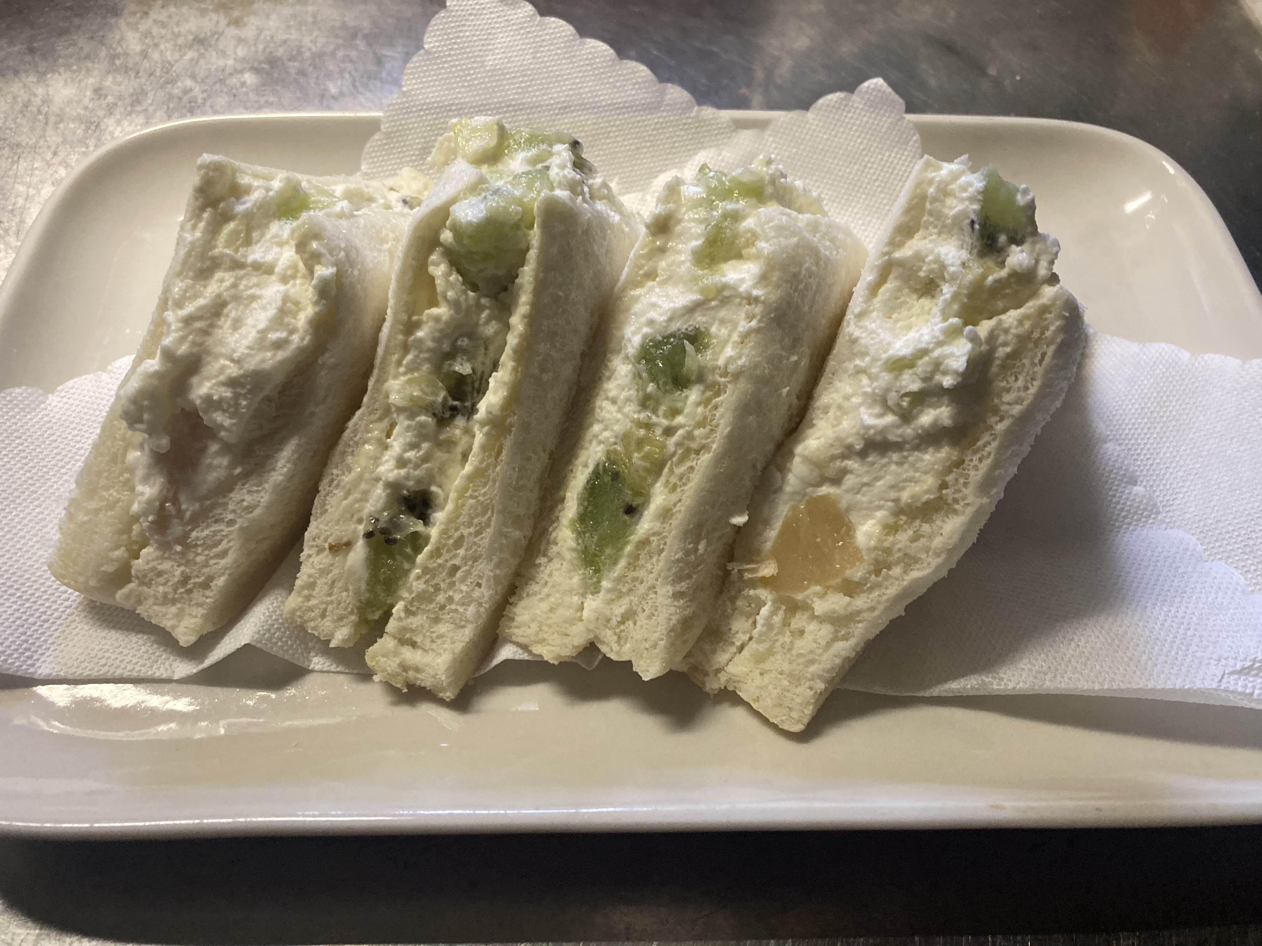 - その上にホイップを塗り適当に切ったキウイと日本の果実の白桃を載せる