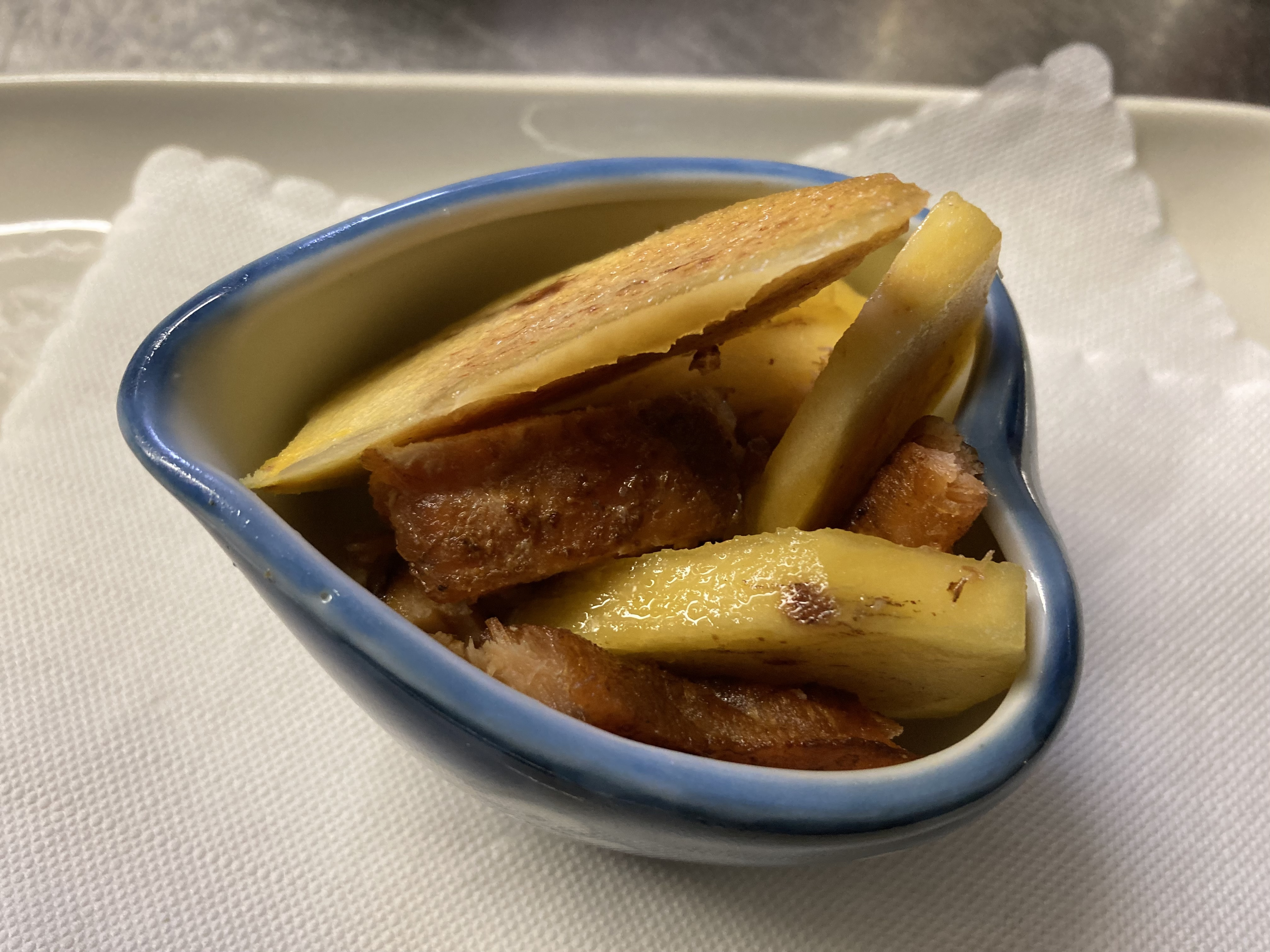 柿と缶つまスモークの鮭ハラスを器に盛る。