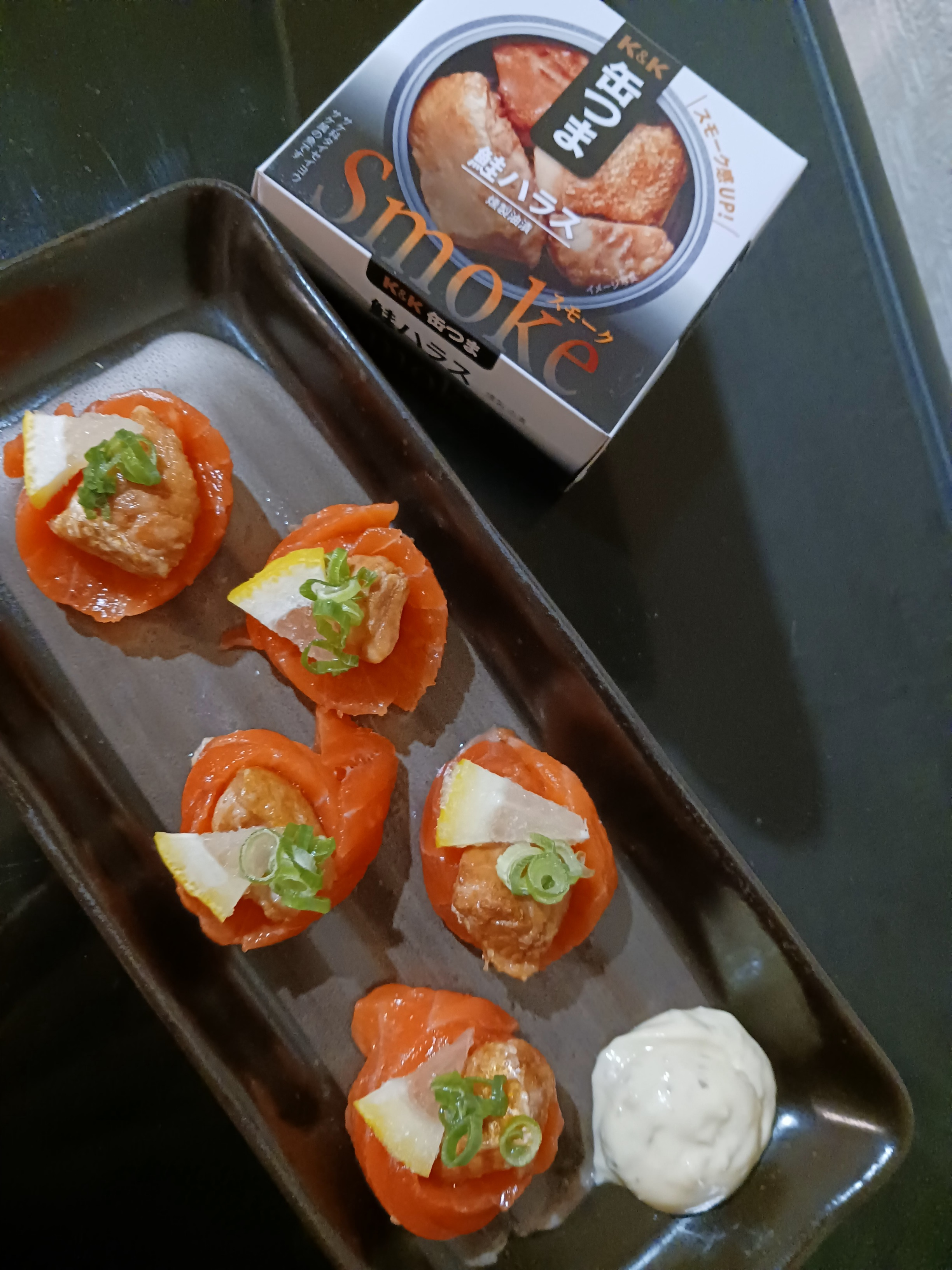 缶つまの鮭を鮭のお刺身で巻いたら楽しい食感のおつまみが完成しました。タルタルソースをつけて食べるとさらにウイスキーやハイボールとの相性もバッチリです。