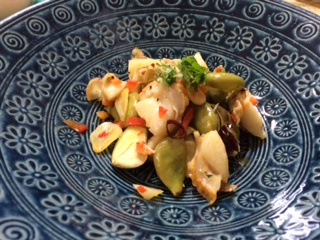 初夏の彩 ホタテ燻製油漬とソラマメのペペロンチーノ