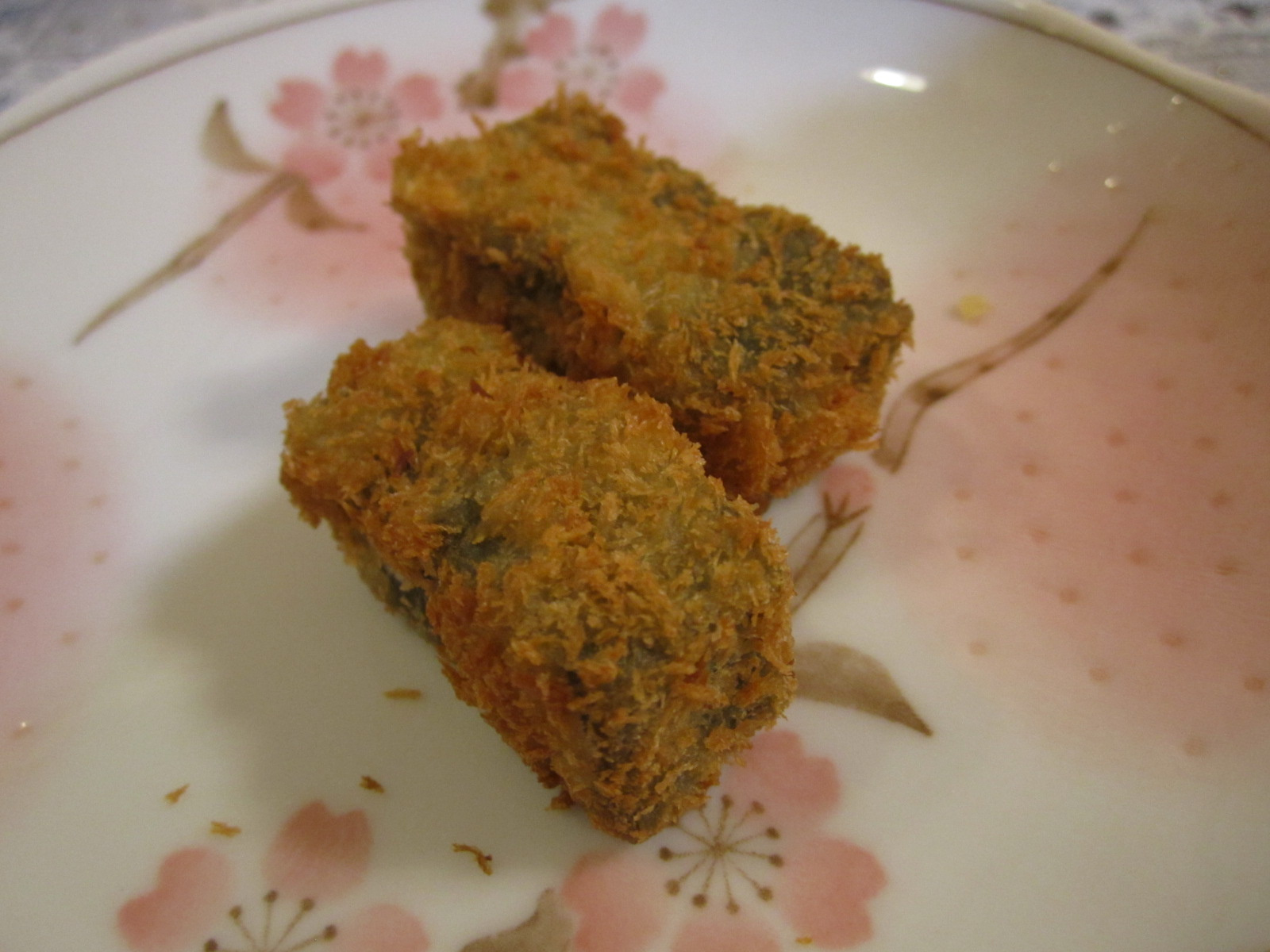 - 2を小麦粉と水を混ぜたものにくぐらせ、パン粉を付け、170℃に熱した揚げ油できつね色になるまで揚げる。