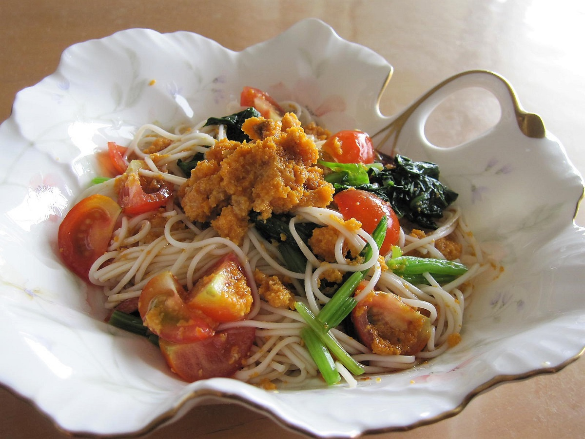 - ボウルに水を切ったそうめん、ほうれん草、ミニトマト、ウニを加え混ぜ合わせる。