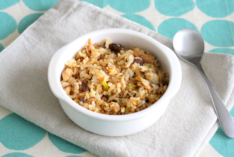 - 1の火を止めて、ごはん、バター、すりおろしにんにく、醤油を加えて混ぜ合わせ、再び火にかけて軽く炒める。