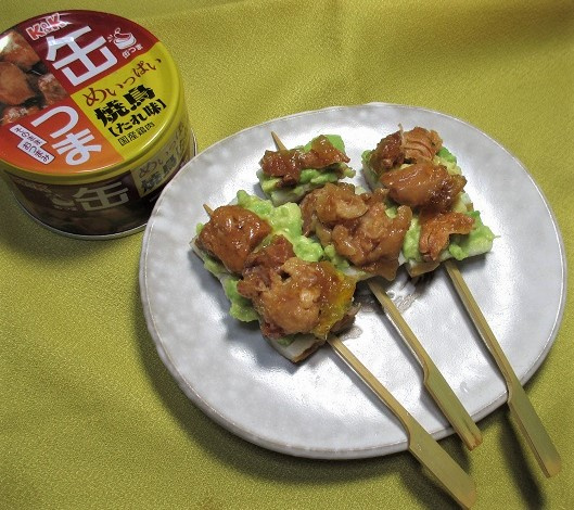 アボカドの上に、缶から出し、少し温めた焼き鳥をのせる。