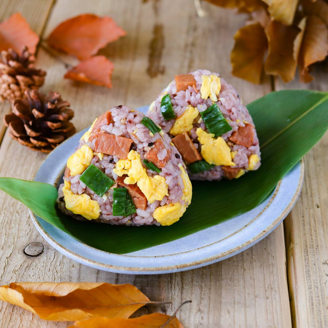 - ごはんに炒り卵、ねぎ、厚切りベーコン、塩少々を入れ混ぜ合わせおにぎりにします