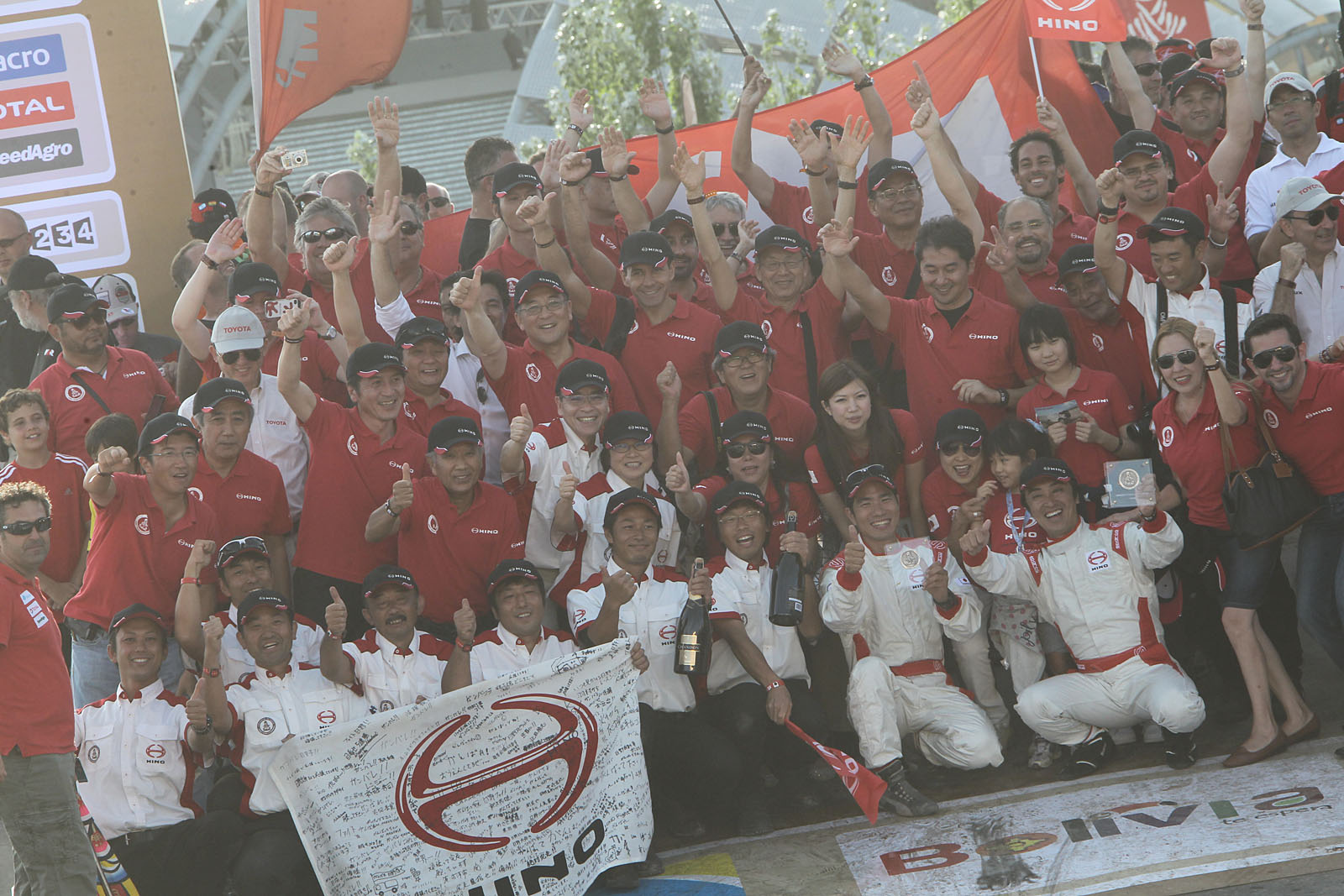 当地でポディウムセレモニーが行われ、土曜日ということもあって数十万人の観客が会場ならびに周辺の道路脇に詰めかけた。日野レンジャーは午後5時 頃、ルーフ上にエンジニアやメカニックを乗せて大きな鯉のぼりや日章旗を掲げながら登壇。2台の乗員は日本から激励に駆けつけた日野自動車市橋保彦社長とがっちり握手をかわし、手を振って歓声に応えていた。