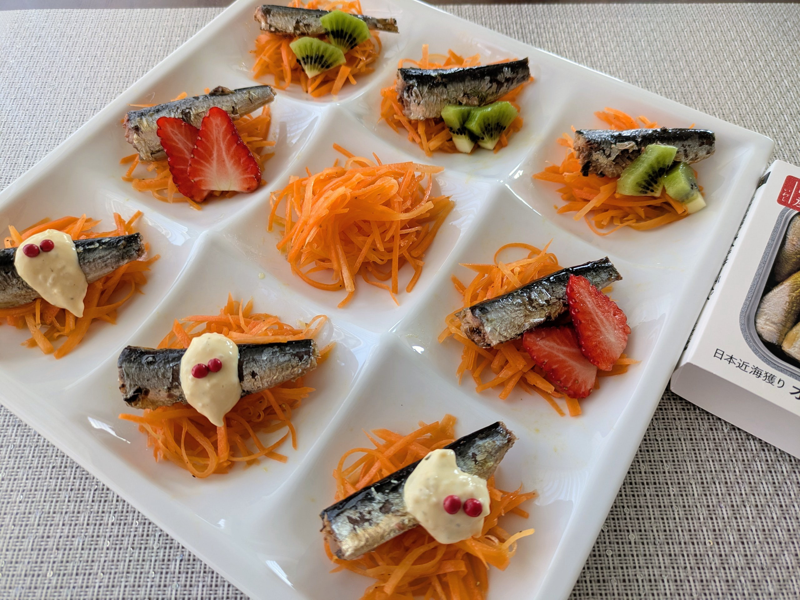 人参ラペのオリーブオイルををいわし油に置き換えて作りました。えっくだもの?と驚いてもらえたら嬉しいです、キーウィやいちごは酸っぱいので酢と同じで、思いの外合います。トーストにのせて食べても美味しいです。