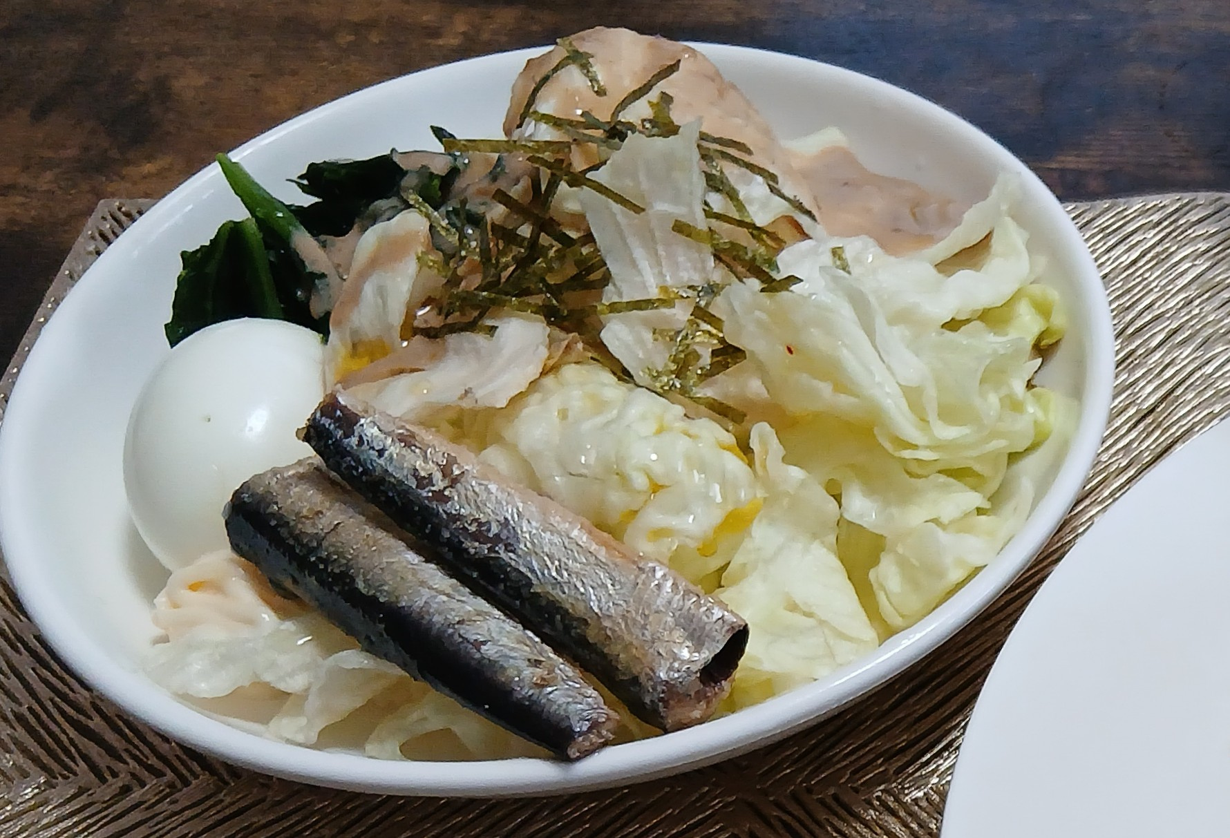 オイルサーデンに味が凝縮されているので、オイルサーデンは少な目ですが、野菜、調味料類と合わせれば、とても満足感あるサラダに。